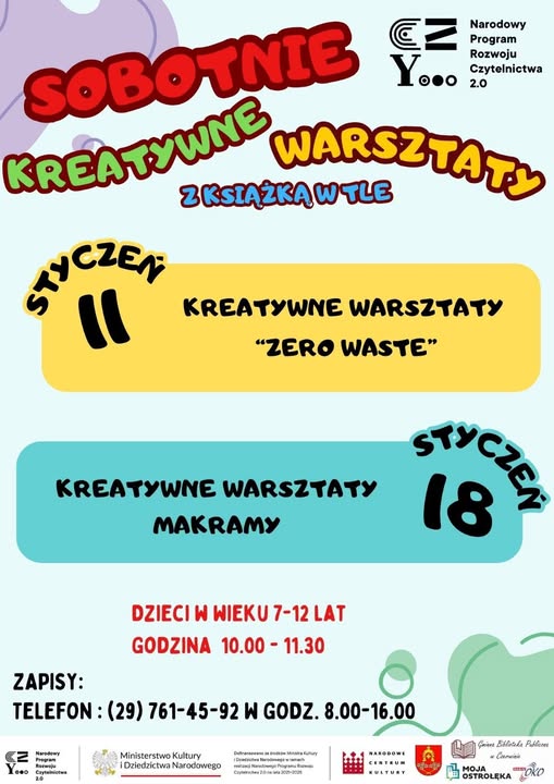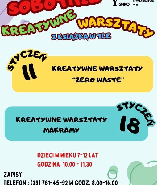 Już w sobotę, 11 stycznia, odbędą się pierwsze zajęcia z cyklu sobotnich kreatywnych warsztatów z książką w tle. Wydarzenie jest częścią projektu „Naszą biblioteka – przygoda na każdej stronie” realizowanego przez Gminną Bibliotekę Publiczną w Czerwinie w ramach Programu „BLISKO”. Szczegóły na plakacie. Zapraszamy do zapisów! Rozpocznijmy nowy rok kreatywnie!