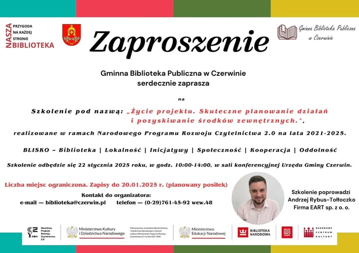 22 stycznia 2025 roku, w godz. 10:00-14:00, w sali konferencyjnej Urzędu Gminy Czerwin, odbędzie się szkolenie pt. „Życie projektu. Skuteczne planowanie działań i pozyskiwanie środków zewnętrznych”, które poprowadzi Andrzej Rybus-Tołłoczko, właściciel firmy EART sp. z o.o, szkoleniowiec z wieloletnim doświadczeniem. Ukończył Wydział Prawa i Administracji na Uniwersytecie Kardynała Stefana Wyszyńskiego, 10 lat pracował w urzędach samorządowych (m.in. w Urzędzie Miasta Stołecznego Warszawy i Urzędzie Miasta Płocka) i rządowych (Mazowiecki Urząd Wojewódzki w Warszawie). Od 20 lat działa w sektorze pozarządowym. Trener realizujący w całej Polsce szkolenia dla przedstawicieli organizacji pozarządowych i urzędów w obszarze: realizacji zadań publicznych, pozyskiwania środków, ochrony danych osobowych, zmian w prawie, wprowadzania narzędzi partycypacyjnych. Przewodniczący Konwentu Wojewódzkich Rad Działalności Pożytku Publicznego, współprzewodniczący Mazowieckiej Rady Działalności Pożytku Publicznego przy Marszałku Województwa Mazowieckiego, członek prezydium Komisji Dialogu Społecznego ds. Edukacji przy urzędzie m.st. Warszawy.